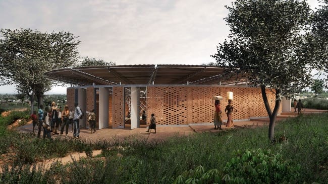 The Bidi Bidi Music & Arts Centre is a low, light-filled brick and steel amphitheater that provides classrooms, a recording studio, and spaces for music training. One side of the building has a series of doors that open, expanding into the outside space so that much larger numbers of people can be accommodated.