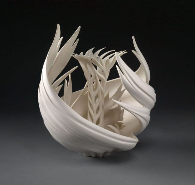 “I use a translucent porcelain body because it has a beautiful surface, and it conveys the qualities of light and shadow that I wish to express,” said McCurdy in her artist statement. “After throwing my vessel on the potter’s wheel, I alter the form to set up a movement of soft shadow. When the porcelain is leather hard, I carve patterns to add energy and counterpoint. I fire my work to cone 10, where the porcelain becomes non-porous and translucent.”