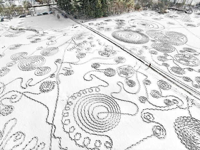 If you’ve looked across an expanse of unbroken snow, you may understand what drives Sonja Hinrichsen, an artist from Germany, who, awed by the beauty of the natural world, wants to showcase it for people in a way that increases their awareness, appreciation, and care of it. One way she does this is by strapping on a set of snowshoes and tramping across fields of snow, turning them into huge artistic canvases. With her feet and the snowshoes, she tracks out works of art that cross and curve, sometimes over massive expanses of snowy landscape.