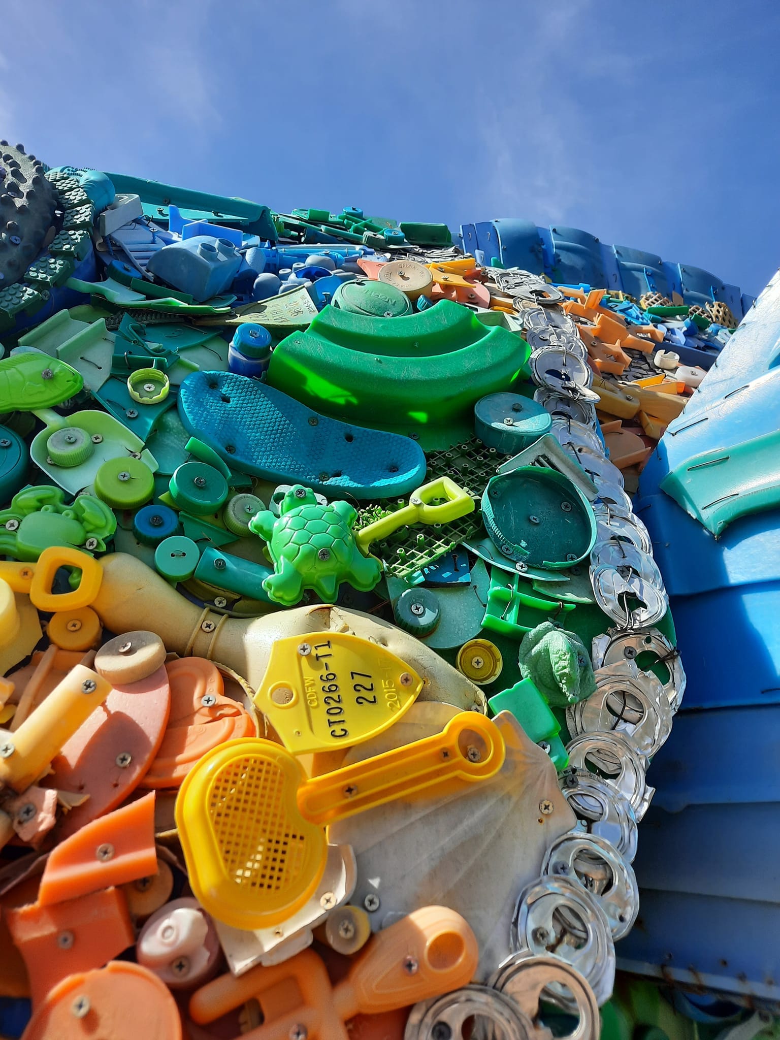 They are playful and colorful creations, and none have been painted. In exhibits, each sculpture is accompanied by a sign describing the animal depicted. Viewers are invited to look closely and identify what plastic objects were used to craft the sculptures. It soon becomes sobering to see these art pieces and realize that the represented creatures live in such polluted and sometimes dangerous debris fields.